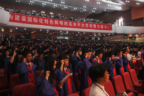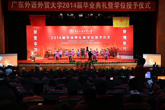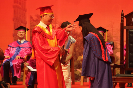 本網訊 云山俊麗,珠水秀美,花開仲夏,鳳舞嶺南。6月24日,我校2014屆首場畢業典禮暨學位授予儀式在南校區大會堂拉開帷幕。首場畢業典禮為管理學院、思政學院以及政管學院856名畢業生授予學位,在接下來的四天內,還有六場畢業典禮將在南北校相繼舉行。校長仲偉合在七場畢業典禮上將為5787名畢業生頒發學位證書,并一一撥穗。校長八分鐘激情洋溢的致辭搏得了在場畢業生的陣陣掌聲和強烈共鳴。