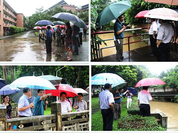 本網訊 為研究和解決困擾我校多年、師生普遍關心的學校防洪排澇治理問題,8月13日下午,市水務局根據市政府要求召集市建委、城管委、水務局和白云區政府等多個部門相關人員在我校北校區召開現場協調會。市水務局副局長吳學偉一行蒞臨我校實地調研,我校黨委副書記盧景輝、后勤處處長楊思等陪同參與。與會人員實地勘察了我校云溪河的水文狀況,吳學偉主持協調會聽取各部門關于河涌治理的意見匯報,商討制定進一步治理對策。