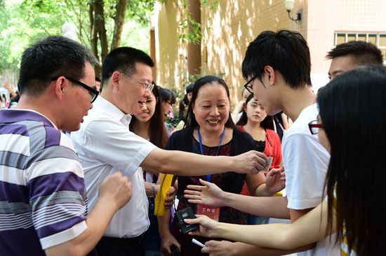 “請家長到休息區(qū)稍作等候,讓孩子獨立完成報名過程。”這是中文學院報到處張貼的溫馨提示。一對來自海南海口的老年夫婦陪同他們的孫女來我校報到。奶奶在主校道的樹蔭下等候?qū)O女領(lǐng)取報到資料。孫女外語學得好,被錄取于我校的意大利語專業(yè)。奶奶心情十分激動:“今天是我最幸福的一天!”