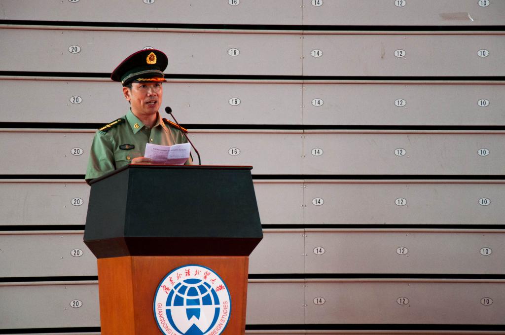 在南校動員會的講話中,校軍訓(xùn)領(lǐng)導(dǎo)小組組長、副校長何傳添對新生提出了四點要求:堅決服從指揮,圓滿完成任務(wù);勇敢接受挑戰(zhàn),培養(yǎng)優(yōu)秀作風(fēng);珍惜集體榮譽,力爭最佳成績;聽從國家召喚,積極投身從軍。他希望新生能肩負(fù)起國家興亡匹夫有責(zé)的歷史使命感,發(fā)揚廣外明德尚行的精神。