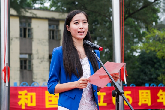 政管學院研一學生代表吳怡也表達了自己作為當代青年對祖國的無限熱愛。之后在吳怡領誓下,參加儀式的師生莊嚴宣誓。最后,大家齊唱《歌唱祖國》,這首熟悉的歌曲表達了廣外師生對于祖國母親的無限祝福。