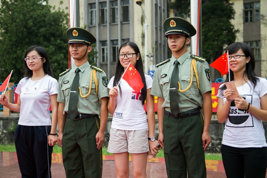 儀式上還有一個亮點是升旗儀式結束舉行的“我與國旗合影”活動。師生們爭相與國旗、升旗儀仗兵合影留念,并現場拿到照片。