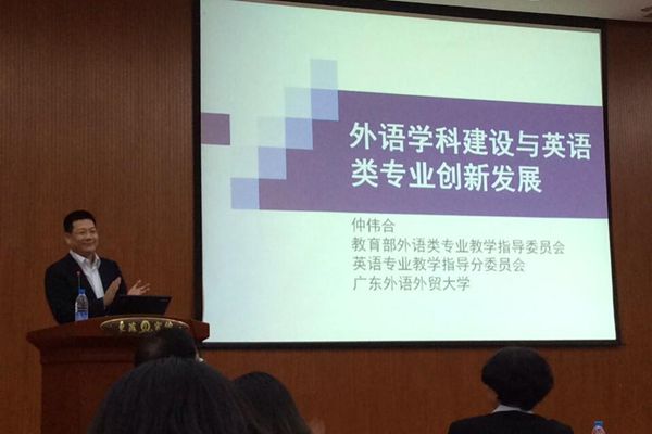 會上,我校16名師生代表與來自全國高校的400多名商務英語教學與研究領域的專家學者,圍繞本次研討會的主題“教學質量標準建設和商務英語專業人才培養”進行了深入探討。仲偉合做了題為“外語學科建設與英語類專業創新發展”的主題發言。他首先介紹了外語學科概況、內涵與范疇,闡釋了我國高等教育由英語專業到英語類專業變遷的歷史背景、發展階段、面臨的問題、發展趨勢,并以三份教學大綱為主線介紹了從英語到英語類(含英語、翻譯和商務英語三專業)的現狀,尤其著重強調了“新國標”對于英語類專業創新發展的指導和要求。從2007年全國第一個商務英語本科專業正式得到教育部批準設立,到目前已經有216所高校開設了商務英語專業。針對這一快速發展的現狀,根據“新國標”,仲偉合在發言中詳細介紹了商務英語專業的培養目標、商務英語人才知識與能力構成、課程設置、商務知識標準、教學原則、教學方法與手段,并提出了六條新的發展思路,得到了與會專家和學者的一致贊同和響應。