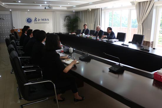 上午,預認證情況匯報工作及領導座談會在MBA402會議室召開。首先,何傳添致歡迎詞,指出AMBA認證是我校強化MBA教育國際化特色、提升國內外品牌知名度的一項重要舉措。自2012年啟動此項目工作以來,學校完成了學科調整,商學院結構整合、領導班子建設,MBA師資隊伍建設、MBA課程方案修改、圖書館外文資源、實驗室設施完善等一系列的持續改進工作。隨后,商學院副院長兼MBA中心執行主任朱文忠代表商學院及MBA教育中心做全英文預認證報告,介紹了大學、學院及MBA項目的發展歷程、特色與優勢,重點匯報了MBA項目的戰略實施、面臨的挑戰及未來的持續改進計劃。隨后,AMBA認證專家和商學院領導進行座談交流。Mark Haydn Oakley、王重鳴和George Iliev對學院及項目的管理、架構、師資力量、資源整合、學科發展、課程設置、國際接軌、自評報告、教學模式等提出了疑問,我校商學院領導對此一一作出詳細具體的解答,并提供充分的文字資料與表格加以說明。