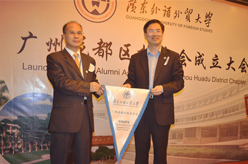 何傳添宣布花都區校友會正式成立,向首任會長、我校88級商務英語專業學生黃平授予會旗及牌匾并代表學校致辭。他對花都區校友會的成立表示祝賀,并向校友們介紹了當前我校的總體概況、發展情況及發展目標等。同時,他誠摯邀請校友常回“家”看看,相約共慶我校50周年華誕。
