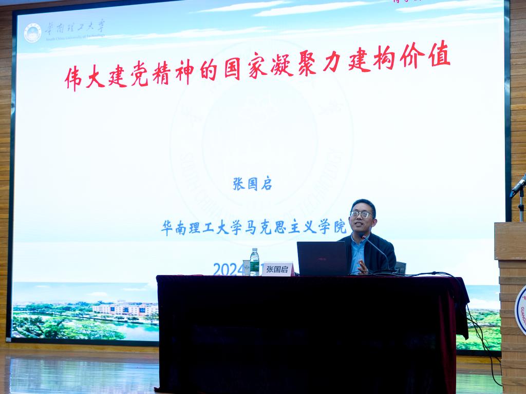 本網訊 12月19日,“鑄魂:精神譜系宣講”報告會暨思政大講堂第57講在我校白云山校區圖書館報告廳舉行。華南理工大學馬克思主義學院副院長張國啟教授作專題宣講報告。學校黨委宣傳部、黨委學生工作部、馬克思主義學院等單位相關負責人,學校思政課教師代表、輔導員代表以及學生代表220余人參加報告會。