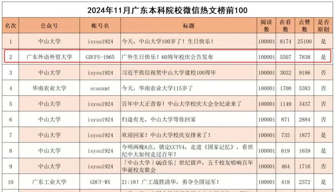 2024年,廣外官微闊步前行,多項排名再創(chuàng)新高。在廣東省本科院校2024年11月微信排行榜排名第4,《廣外生日快樂!60周年校慶公告發(fā)布》等推文閱讀量突破10萬,在2024年11月廣東本科院校微信熱文榜排名第2。