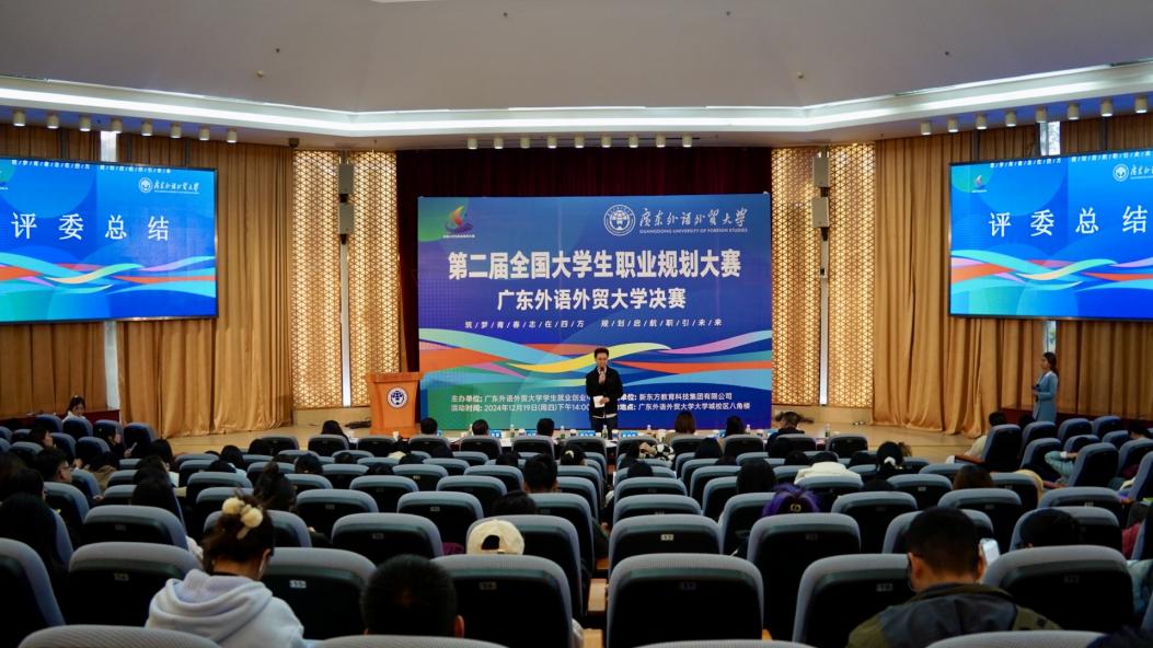 本網(wǎng)訊 12月19日下午,第二屆全國(guó)大學(xué)生職業(yè)規(guī)劃大賽廣東外語(yǔ)外貿(mào)大學(xué)決賽于大學(xué)城校區(qū)八角樓會(huì)議室舉行,16名決賽選手一展風(fēng)采。學(xué)生就業(yè)創(chuàng)業(yè)中心和相關(guān)學(xué)院的負(fù)責(zé)人、指導(dǎo)老師出席本次比賽,共300多名學(xué)生現(xiàn)場(chǎng)觀(guān)摩。