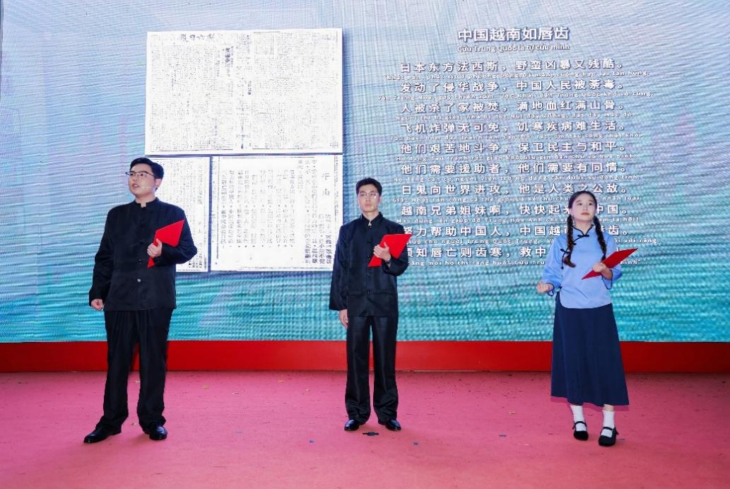 在開幕式上,東南亞學(xué)院越南語專業(yè)2023級(jí)學(xué)生李忠儀、劉曉蕓以中越雙語朗誦革命詩篇《中國越南如唇齒》,贏得全場掌聲。這首詩出自胡志明主席1940年12月4日在中國《救亡日報(bào)》發(fā)表的《安南歌謠與中國抗戰(zhàn)》一文。