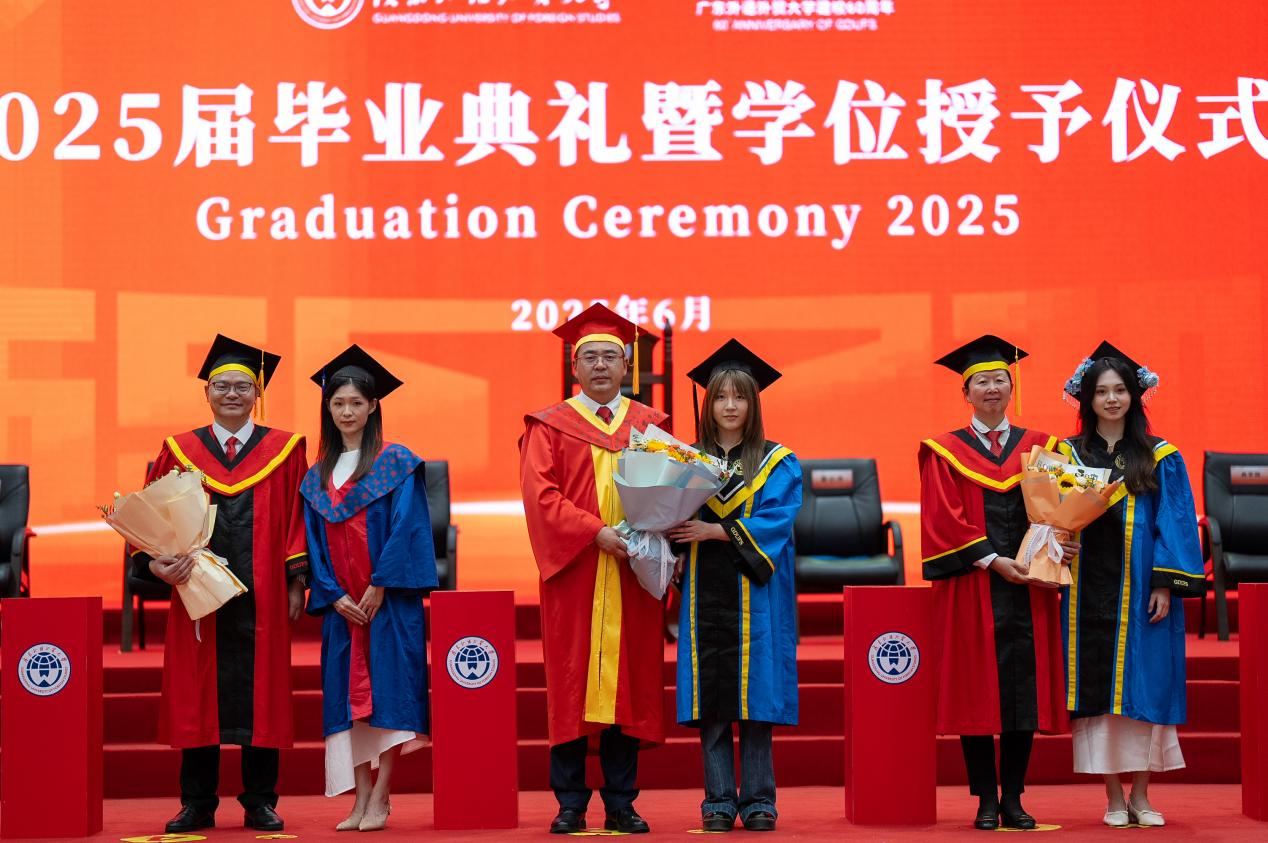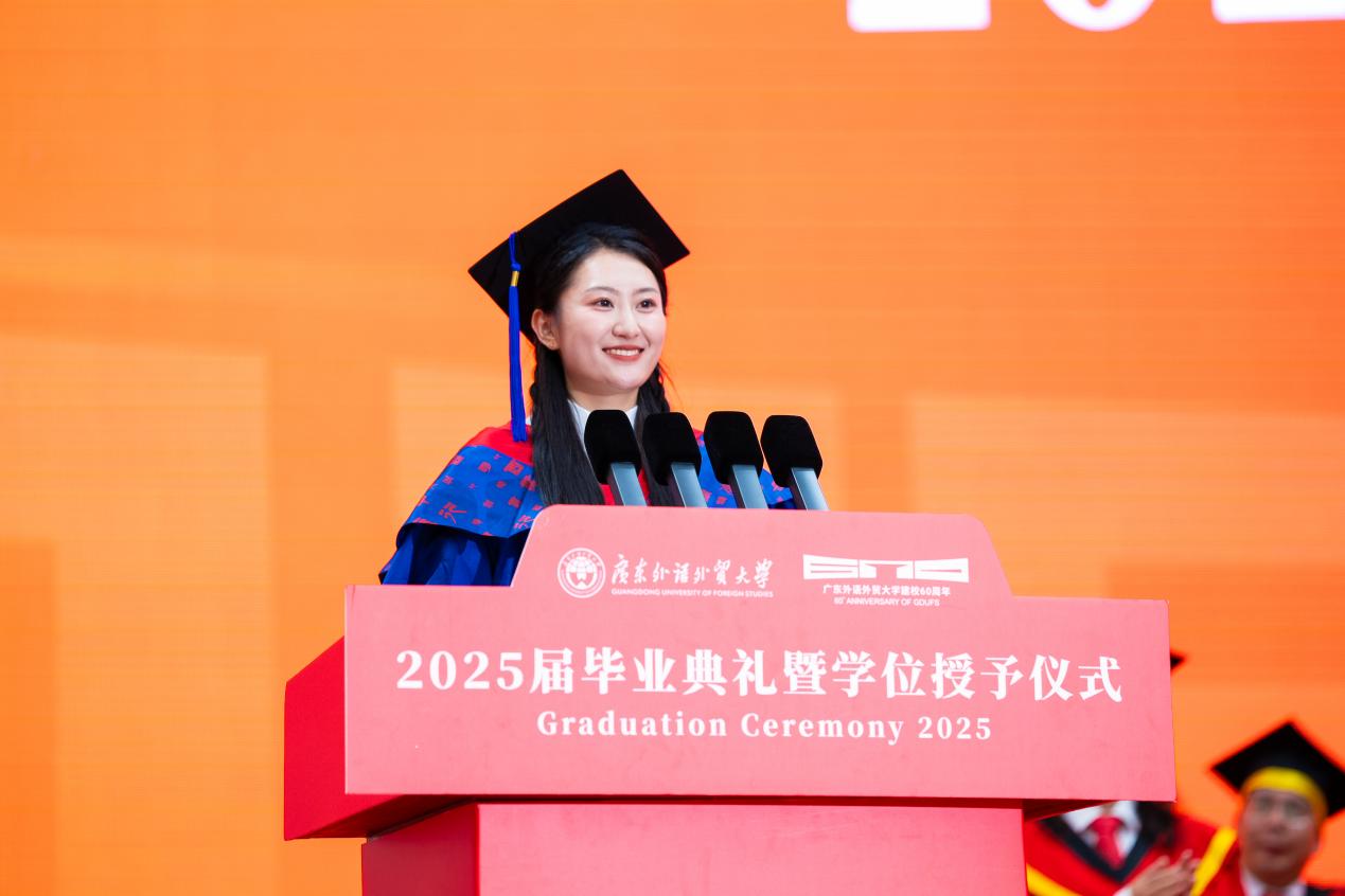 畢業生代表、新聞與傳播學院碩士畢業生尋冬雪在即將入職騰訊公司之際,滿懷深情地表示,“白云山青”是母校賦予我們的學術脊梁,“碧溪水藍”記錄著師友共度的美好時光。感恩母校,用學貫中西的沃土,讓廣外人得以在多元文化的碰撞中不斷成長、追逐夢想,祝愿廣外勇立潮頭,桃李芬芳。