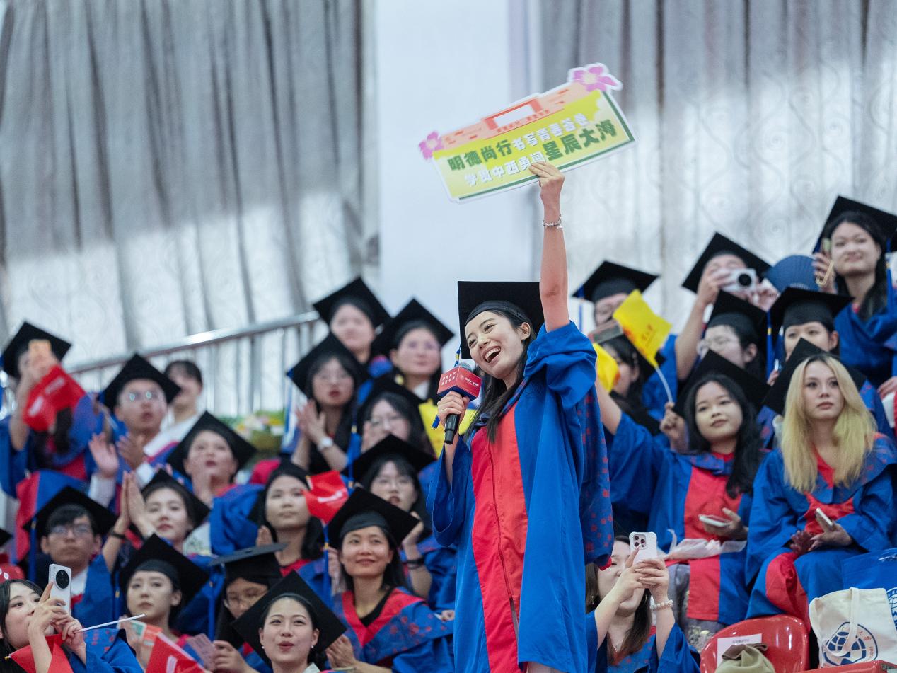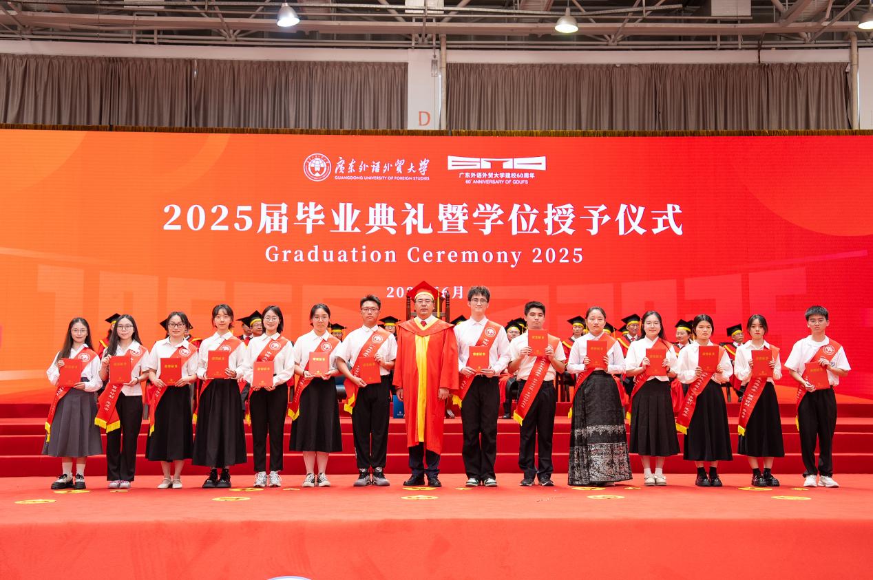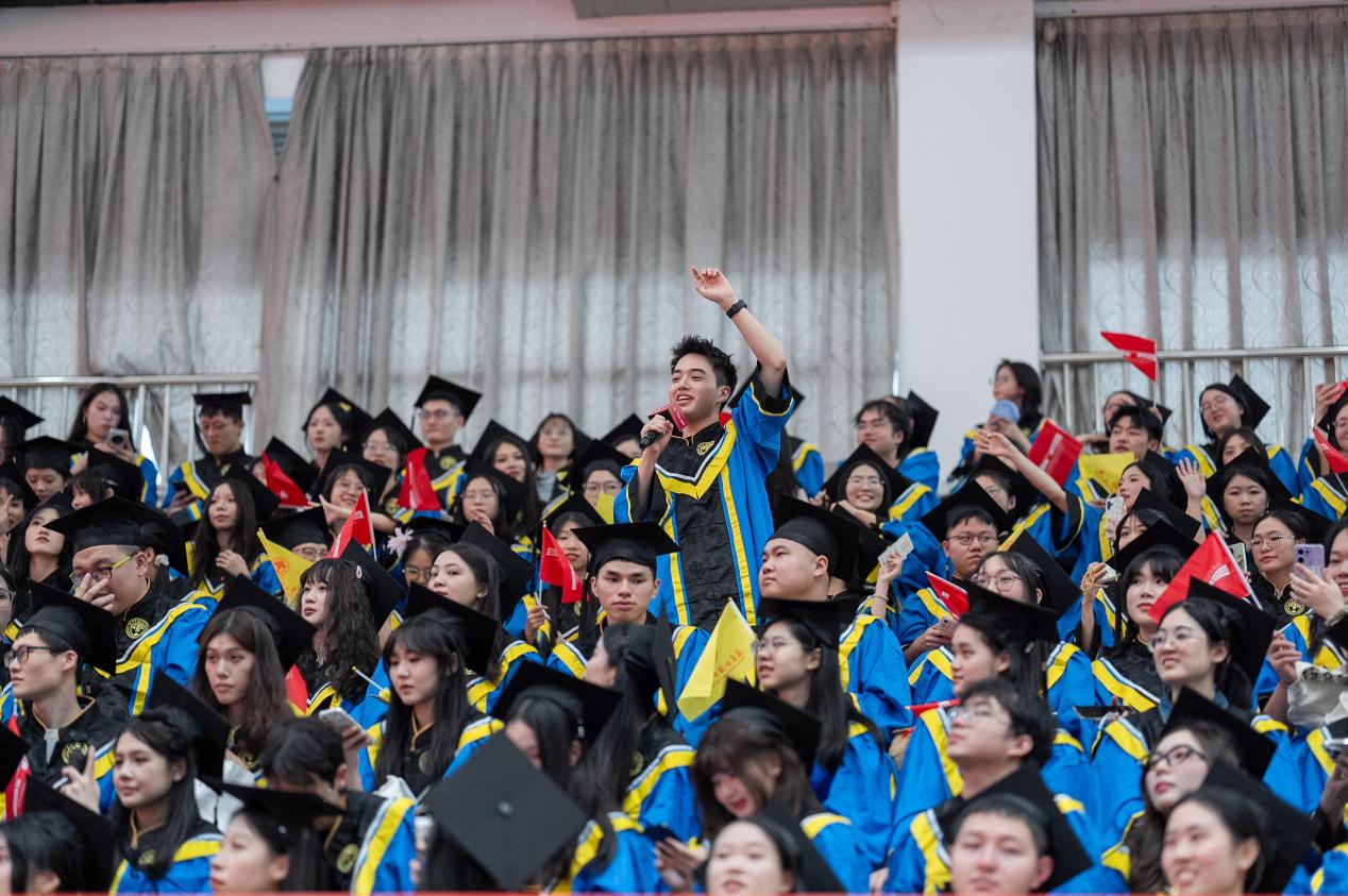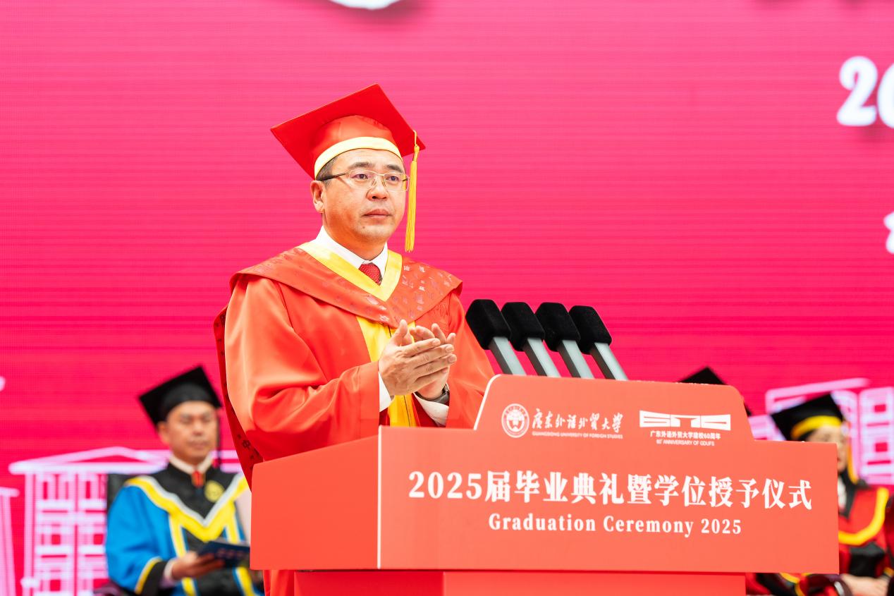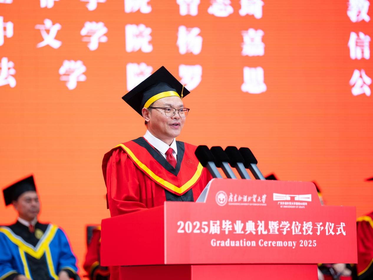 把握腳下路,方能勇立潮頭。閆相斌勉勵畢業生們深刻理解所處的歷史方位,認清機遇與挑戰,才能校準方向,砥礪前行。他表示,你們腳下的路通向強國偉業,這是你們施展才華的人生主場。廣外已為你們鋪就成長的道路,遠方需要你們自己邁開腳步,向人生目標邁進,與國家需求同頻,跟時代脈搏呼應。你們腳下的路穿越百年變局,這是你們探索未來的全新征途。只要你們秉持廣外人敢為人先的闖勁、永不服輸的韌勁、善作善成的干勁,就一定能夠在風浪中找到新航道,在變局中闖出新天地。你們腳下的路伴隨科技浪潮,這是你們自我突破的重要賽道。唯有保持終身學習的毅力,提高擁抱變革的勇氣,邁開跨界融合的步伐,用語言能力銜接技術工具,用人文思維駕馭算法邏輯,才能在數字賽道上掌握主動、馳騁未來。