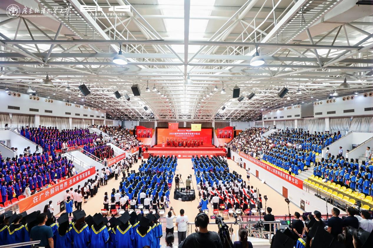 本網訊 伴隨著別開生面的畢業快閃,全體畢業生合唱多語種生日快樂歌,共同祝福母校60周年生日快樂,瞬間點燃現場氛圍,這是廣外2025屆畢業典禮開始前的精彩瞬間,氣氛溫馨而熱烈。6月27日,2025屆畢業典禮暨首場學位授予儀式在白云山校區舉行。根據安排,大學城校區2025屆畢業生學位授予儀式將于6月28日下午舉行。