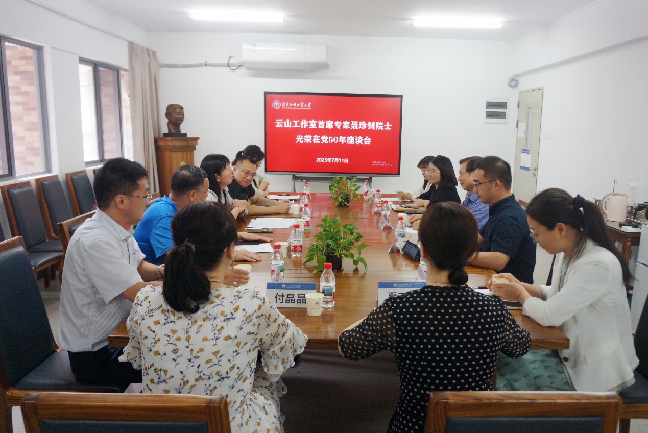 本網(wǎng)訊 7月11日下午,英文學院在白云山校區(qū)一教446會議室召開云山工作室首席專家聶珍釗院士“光榮在黨50年”座談會,氣氛莊重而熱烈。校黨委副書記葛小月為聶珍釗佩戴“光榮在黨50年”紀念章,與英文學院領導班子成員、黨員代表共同向聶珍釗院士致以崇高敬意,傳承老黨員的忠誠與擔當。會議由英文學院黨委書記紀彬主持。