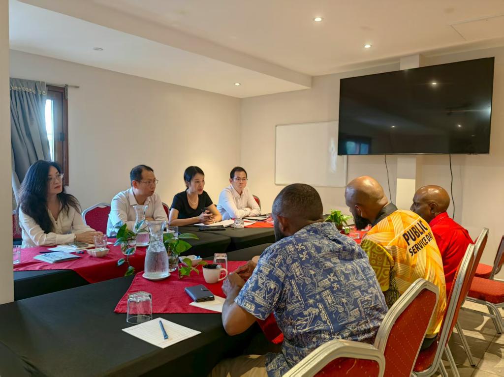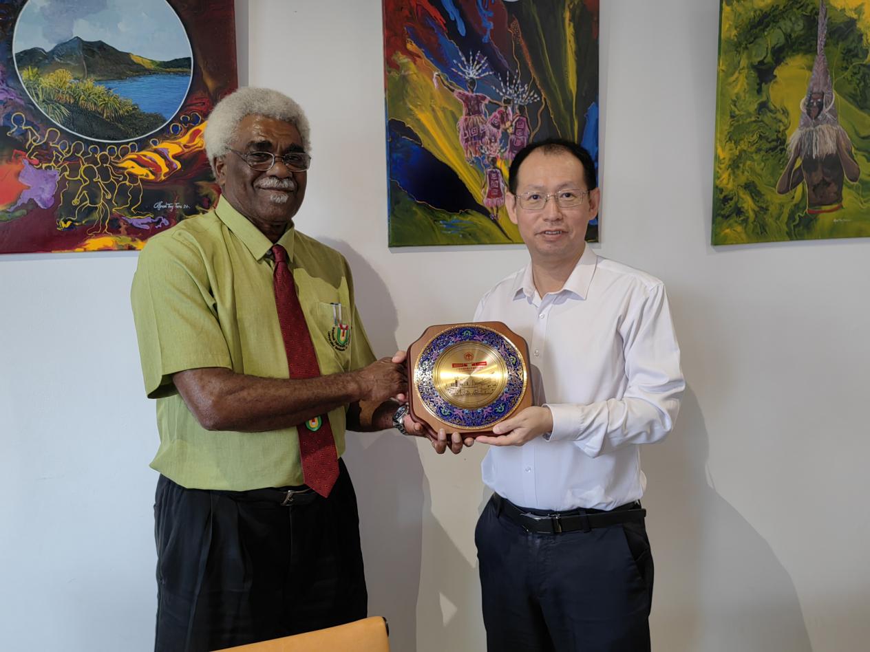 在瓦努阿圖期間,代表團先后拜訪了中國駐瓦努阿圖大使館、瓦努阿圖國立大學以及中國土木工程集團有限公司南太平洋公司。拜訪中國駐瓦努阿圖大使李名剛時,申明浩介紹了學校的特色優勢,以及近年來重點圍繞太平洋島國重點區域推進區域國別研究,以及海外孔子課堂建設等情況。李名剛介紹了近年來中國及廣東與瓦努阿圖開展的交流合作項目,表示將積極幫助廣外與瓦努阿圖在多領域建立更加緊密的合作關系。