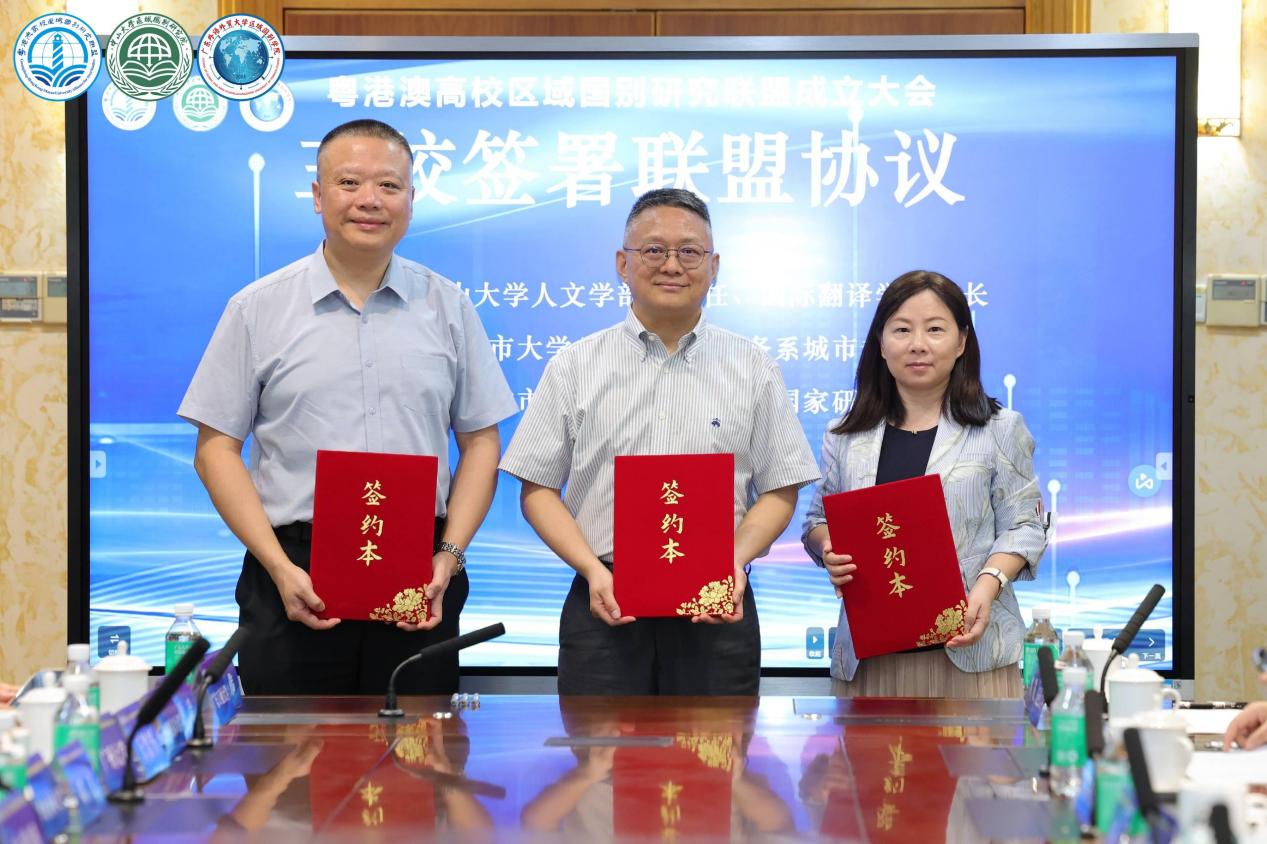 中山大學人文學部副主任、國際翻譯學院院長常晨光教授,香港城市大學公共與國際事務系城市專業主任王珺教授,澳門城市大學副校長葉桂平教授分別代表三所聯盟發起單位簽署協議。