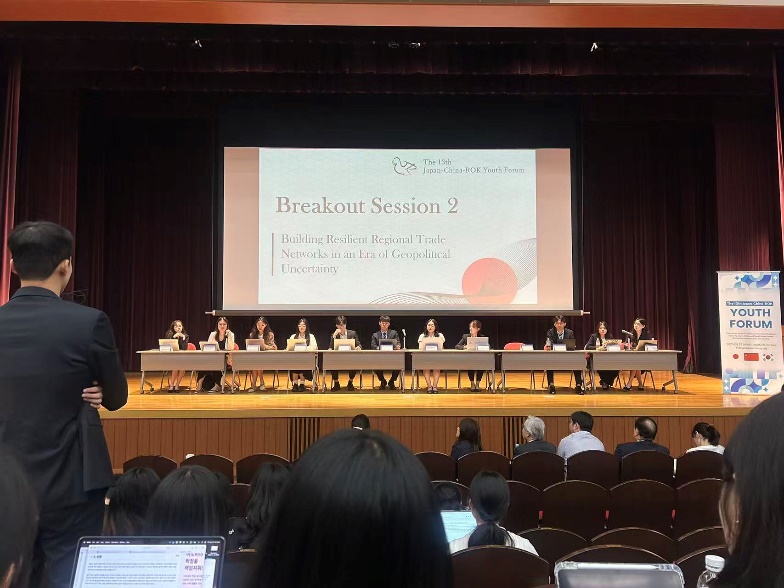 在關(guān)于“在地緣政治不確定性背景下構(gòu)建具有韌性的地區(qū)貿(mào)易網(wǎng)絡(luò)”(Building Resilient Regional Trade Networks in an Era of Geopolitical Uncertainty) 的議題討論中,王詩(shī)茜指出了中日韓三國(guó)各自在建立區(qū)域貿(mào)易網(wǎng)絡(luò)方面所面臨的挑戰(zhàn),并表示雖然中日韓三國(guó)的國(guó)內(nèi)情況和發(fā)展程度有所差異,但三國(guó)經(jīng)貿(mào)往來(lái)密切,建立穩(wěn)定的區(qū)域貿(mào)易網(wǎng)絡(luò)符合三國(guó)的共同利益,各方應(yīng)堅(jiān)持多邊主義的立場(chǎng)。在三方談到建立地區(qū)貿(mào)易網(wǎng)絡(luò)面臨的地緣政治挑戰(zhàn)時(shí),楊垚向日韓代表提出如何看待美國(guó)的對(duì)等關(guān)稅對(duì)地區(qū)貿(mào)易網(wǎng)絡(luò)影響的問(wèn)題,希望推動(dòng)三方在該問(wèn)題上進(jìn)行進(jìn)一步的思考和交流,并強(qiáng)調(diào)三方建立信任的重要性。在上午的會(huì)期結(jié)束后,王詩(shī)茜作為中方主持人對(duì)三國(guó)代表已達(dá)成的共識(shí)和仍存在的分歧進(jìn)行了回顧,并強(qiáng)調(diào)三國(guó)深化溝通、增進(jìn)互信、凝聚共識(shí)并達(dá)成協(xié)作的重要性。