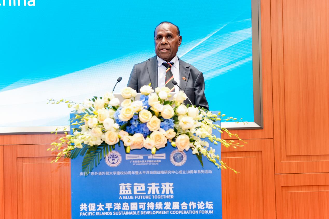 巴布亞新幾內亞駐華大使薩迪厄斯·卡姆巴內以“太平洋島國可持續發展的挑戰與路徑”為題,強調太平洋可持續發展關乎全球,海平面上升等挑戰不僅正在威脅島民生計,也是全球發展的當務之急。因此,大使表示,太平洋島國深切感謝中國支持,中國搭建的平臺與“一帶一路”倡議助力中國—太平洋島國交流與合作。中國太平洋島國合作已覆蓋基建、醫療、教育等領域,大批巴新學生赴華深造。最后,大使呼吁深化人力與教育合作,將論壇共識轉化為行動,攜手保護海洋生態,共推可持續發展。