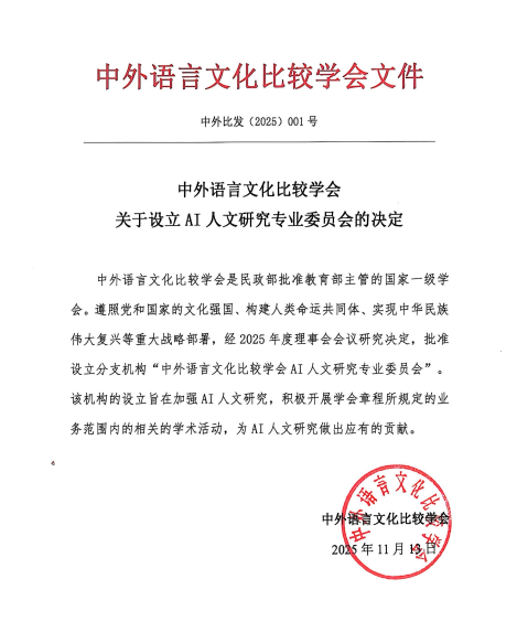 本網(wǎng)訊 近日,經(jīng)中外語(yǔ)言文化比較學(xué)會(huì)2025年度理事會(huì)會(huì)議研究決定,中外語(yǔ)言文化比較學(xué)會(huì)AI人文研究專業(yè)委員會(huì)正式獲批成立。