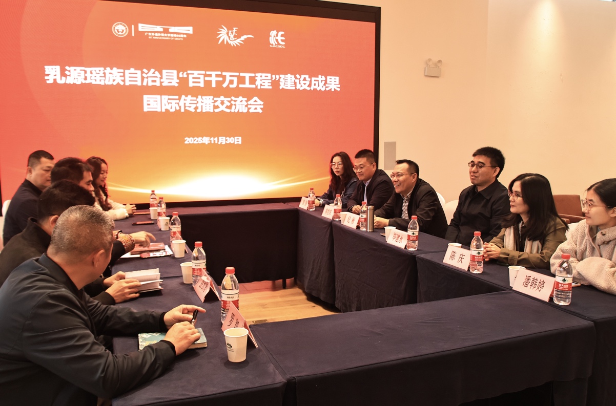 大會(huì)期間,會(huì)議主辦方還特別組織召開(kāi)乳源瑤族自治縣“百千萬(wàn)工程”建設(shè)成果國(guó)際傳播交流會(huì),翻譯批評(píng)委員會(huì)的專(zhuān)家代表與乳源政府及相關(guān)部門(mén)圍繞瑤族文化的國(guó)際傳播、文化資源轉(zhuǎn)化、鄉(xiāng)村振興中的語(yǔ)言服務(wù)等議題展開(kāi)深度交流。會(huì)議由廣外英文學(xué)院黨委書(shū)記紀(jì)彬主持,譯國(guó)譯民董事長(zhǎng)、廣外在讀博士生林世宋、翻譯批評(píng)專(zhuān)委會(huì)理事陳慶副教授、翻譯批評(píng)專(zhuān)委會(huì)理事潘韓婷副教授、廣外-省委黨校駐乳源“雙百行動(dòng)”工作隊(duì)隊(duì)長(zhǎng)畢建勇、廣外教務(wù)部副部長(zhǎng)唐靜、乳源瑤族自治縣副縣長(zhǎng)鄧曉羚、宣傳部副部長(zhǎng)盤(pán)永周、統(tǒng)戰(zhàn)部常務(wù)副部長(zhǎng)蘭賢、教育局副局長(zhǎng)卓蓉珍、文廣旅體局副局長(zhǎng)羅凱出席會(huì)議。現(xiàn)場(chǎng)交流氛圍熱烈,觀點(diǎn)相互激蕩,靈感頻頻迸發(fā),與會(huì)各方在跨領(lǐng)域的思維碰撞中進(jìn)一步拓寬了視野、凝聚了共識(shí)。參會(huì)代表結(jié)合自身研究,同步將學(xué)術(shù)議題延伸至文化國(guó)際傳播與鄉(xiāng)村振興的現(xiàn)實(shí)需求,提出“智能體賦能?chē)?guó)際傳播”的構(gòu)想,建議依托廣東鄉(xiāng)村振興教學(xué)智能體的建設(shè)經(jīng)驗(yàn),通過(guò)技術(shù)賦能的教學(xué)訓(xùn)練,提升學(xué)生在鄉(xiāng)村振興主題下的國(guó)際傳播能力與跨文化敘事素養(yǎng),為中國(guó)鄉(xiāng)村振興實(shí)踐的國(guó)際話語(yǔ)建構(gòu)培育專(zhuān)業(yè)化人才。此外,參會(huì)代表還從翻譯教育、跨文化傳播等角度,倡議將高校資源與地方需求深度聯(lián)動(dòng),形成“科研—教學(xué)—地方實(shí)踐”互促機(jī)制,為乳源的國(guó)際傳播體系建設(shè)提供長(zhǎng)期智力支持。這是專(zhuān)委會(huì)發(fā)揮學(xué)術(shù)組織優(yōu)勢(shì)、支持欠發(fā)達(dá)地區(qū)文化建設(shè)的具體行動(dòng),也標(biāo)志著翻譯批評(píng)研究從學(xué)術(shù)論壇進(jìn)一步走向社會(huì)服務(wù)與文化實(shí)際需求。同時(shí),這也是作為承辦方的廣外英文學(xué)院聯(lián)合專(zhuān)委會(huì)發(fā)揮國(guó)際化辦學(xué)特色,助力學(xué)校“雙百行動(dòng)”走深走實(shí)的有益實(shí)踐,為高校服務(wù)地方發(fā)展開(kāi)拓了新的路徑。