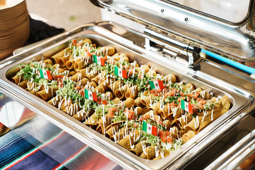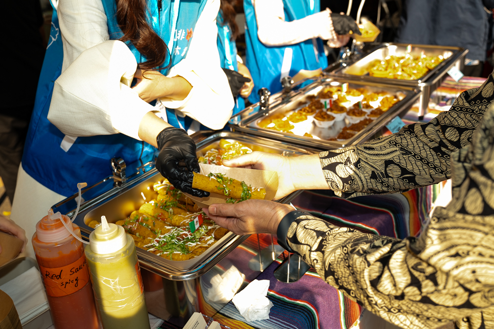 墨西哥攤位以玉米餅為底,鋪滿烤香腸與玉米粒,搭配酥脆可口的雞肉炸卷和造型別致的迷你帽形小吃,辣椒香與麥香在齒間交織,風味濃郁。