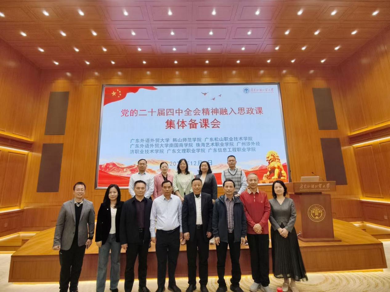 本網(wǎng)訊 12月1日,我校馬克思主義學院和結(jié)對共建的7所省內(nèi)高校馬克思主義學院,在白云山校區(qū)國際會議廳通過線上線下相結(jié)合的方式,聯(lián)合舉辦黨的二十屆四中全會精神融入思政課集體備課會。結(jié)對共建的省內(nèi)高校馬克思主義學院包括廣東外語外貿(mào)大學南國商學院、珠海藝術(shù)職業(yè)學院、廣州涉外經(jīng)濟職業(yè)技術(shù)學院、廣東文理職業(yè)學院、廣東信息工程職業(yè)學院、韓山師范學院、廣東松山職業(yè)技術(shù)學院等高校馬克思主義學院。集體備課會由馬克思主義學院副院長朱海龍主持會議,黨委宣傳部副部長劉祥和、教務部教材管理科科長賀江群、教學質(zhì)量監(jiān)測與評估中心副主任賴文才等出席此次會議。