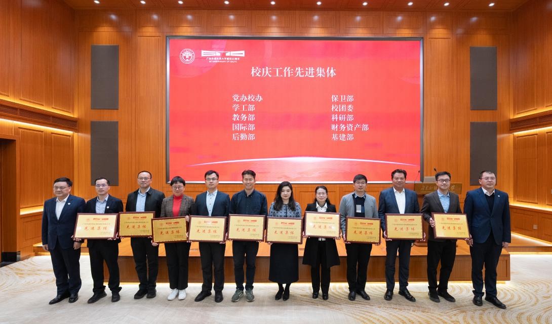 為表彰先進、樹立典范,學校組織開展了60周年校慶工作先進集體和校友工作貢獻獎評選活動。會上,副校長謝偉光宣讀了表彰決定,石佑啟書記、閆相斌校長、劉建達副校長分別為獲獎單位頒獎。