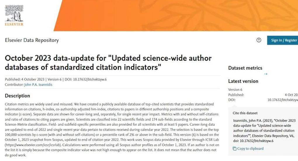 據悉,全球前2%頂尖科學家榜單是愛思唯爾數(shù)據庫(Elsevier Data Repository)與斯坦福大學John P. A. Ioannidis教授團隊合作的項目成果,發(fā)布在Elsevier旗下的Mendeley Data網站上。榜單基于Scopus數(shù)據庫的引用數(shù)據系統(tǒng)分析,以被引數(shù)(區(qū)分自引和他引,提供自引數(shù)據)、H指數(shù)、HM因子等6種綜合指標 (composite score,C-score),根據 “生涯影響力”和“年度影響力”從近700 萬名科學家中遴選出世界排名前2%的科學家,分為22個領域和176個細分子領域;為科學家長期科研表現(xiàn)提供了一個衡量指標,能夠更客觀、更真實地反映科學家的影響力 。