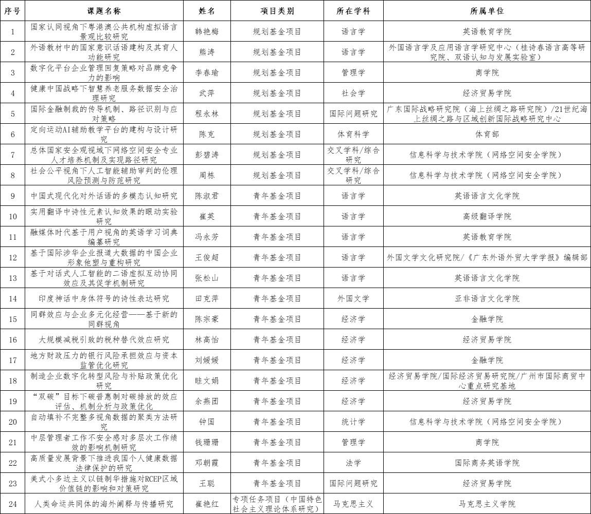 從項(xiàng)目類別和學(xué)科分布來(lái)看:立項(xiàng)規(guī)劃基金項(xiàng)目8項(xiàng)、青年基金項(xiàng)目15項(xiàng)、專項(xiàng)任務(wù)項(xiàng)目1項(xiàng);涵蓋11個(gè)學(xué)科,其中,語(yǔ)言學(xué)7項(xiàng)、位居全國(guó)第1,經(jīng)濟(jì)學(xué)5項(xiàng),管理學(xué)、國(guó)際問(wèn)題研究和交叉學(xué)科各2項(xiàng),外國(guó)文學(xué)、法學(xué)、社會(huì)學(xué)、馬克思主義、體育科學(xué)和統(tǒng)計(jì)學(xué)各1項(xiàng)。