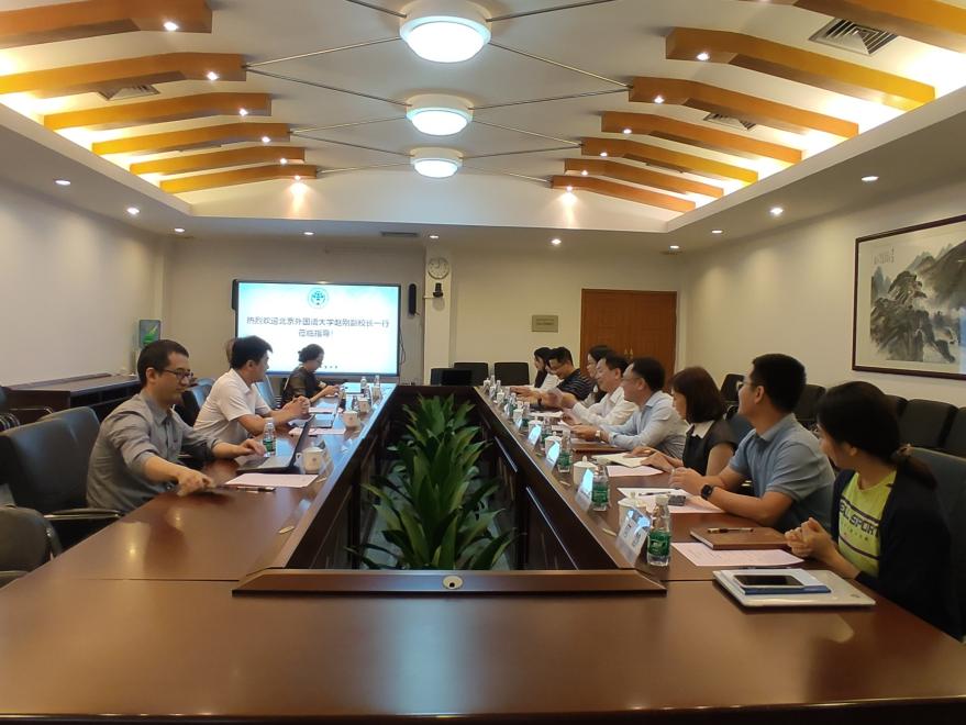 北京外國語大學科研處副處長李思飛、科研規劃與項目管理辦公室主任馬軼倫隨隊調研座談。我??蒲胁?、西方語言文化學院相關人員參加活動。