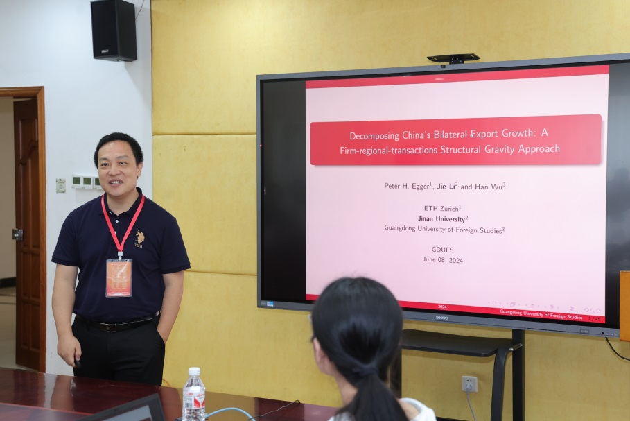 李杰教授(暨南大學產業研究院副院長)發表了題為“Decomposing China’s Bilateral Export Growth: A Firm-regional-transactions Structural Gravity Approach”的演講,從貿易經濟學角度揭示了中國地區四個基本特征的異質性,分別是產品生產的質量、企業的生產力、當地因素成本以及企業的市場可行性。研究說明了基本因素的異質性在一定程度上導致了中國各縣出口參與的不平等,并發現市場的可變潛在成本和固定成本都對區域出口有影響。研究提出如果這些因素沒有改變,中國各地區的出口市場參與度會比實際情況更加不平等。