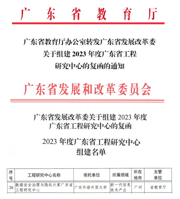 近日,我校依托信息科學與技術學院(網絡空間安全學院)申報的“數據安全治理與隱私計算廣東省工程研究中心”成功獲得廣東省發展和改革委員會批復組建。