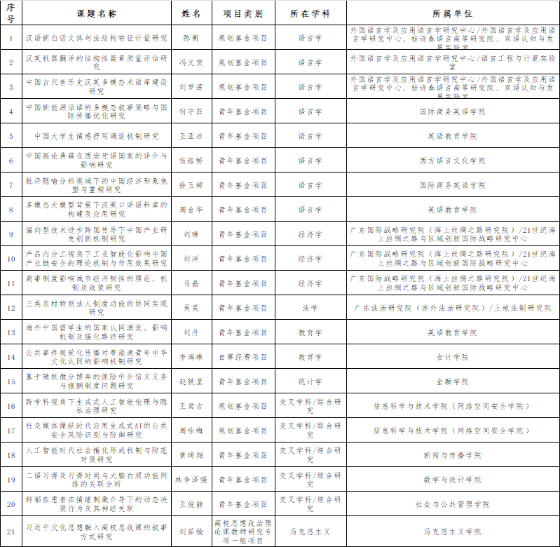從單位分布來看:英語教育學院,廣東國際戰略研究院(海上絲綢之路研究院)/21世紀海上絲綢之路與區域創新國際戰略研究中心各3項,國際商務英語學院,信息科學與技術學院(網絡空間安全學院),外國語言學及應用語言學研究中心/外國語言學及應用語言學研究中心、桂詩春語言高等研究院、雙語認知與發展實驗室各2項,馬克思主義學院、會計學院、金融學院、西方語言文化學院、社會與公共管理學院、新聞與傳播學院、數學與統計學院、外國語言學及應用語言學研究中心/語言工程與計算實驗室、廣東法治研究院(涉外法治研究院)/土地法制研究院各1項。